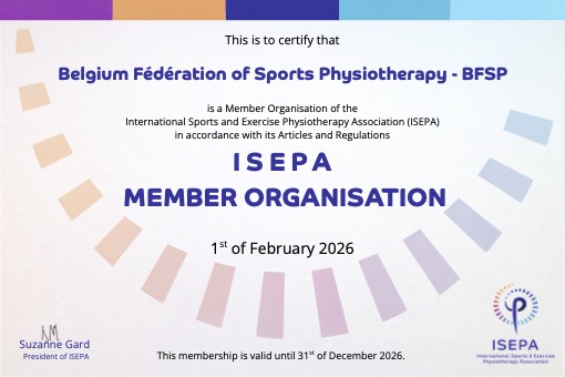 Belgium Federation of Sports Physiotherapy est l'unique Association représentant les kinésithérapeutes du sport en Belgique et reconnue officiellement par WCPT et IFSPT.